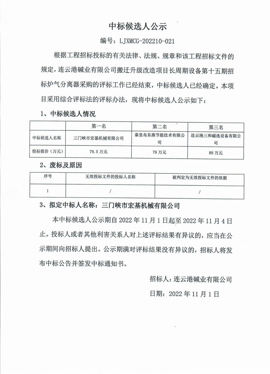 爐氣分離器采購招標中標候選人公示