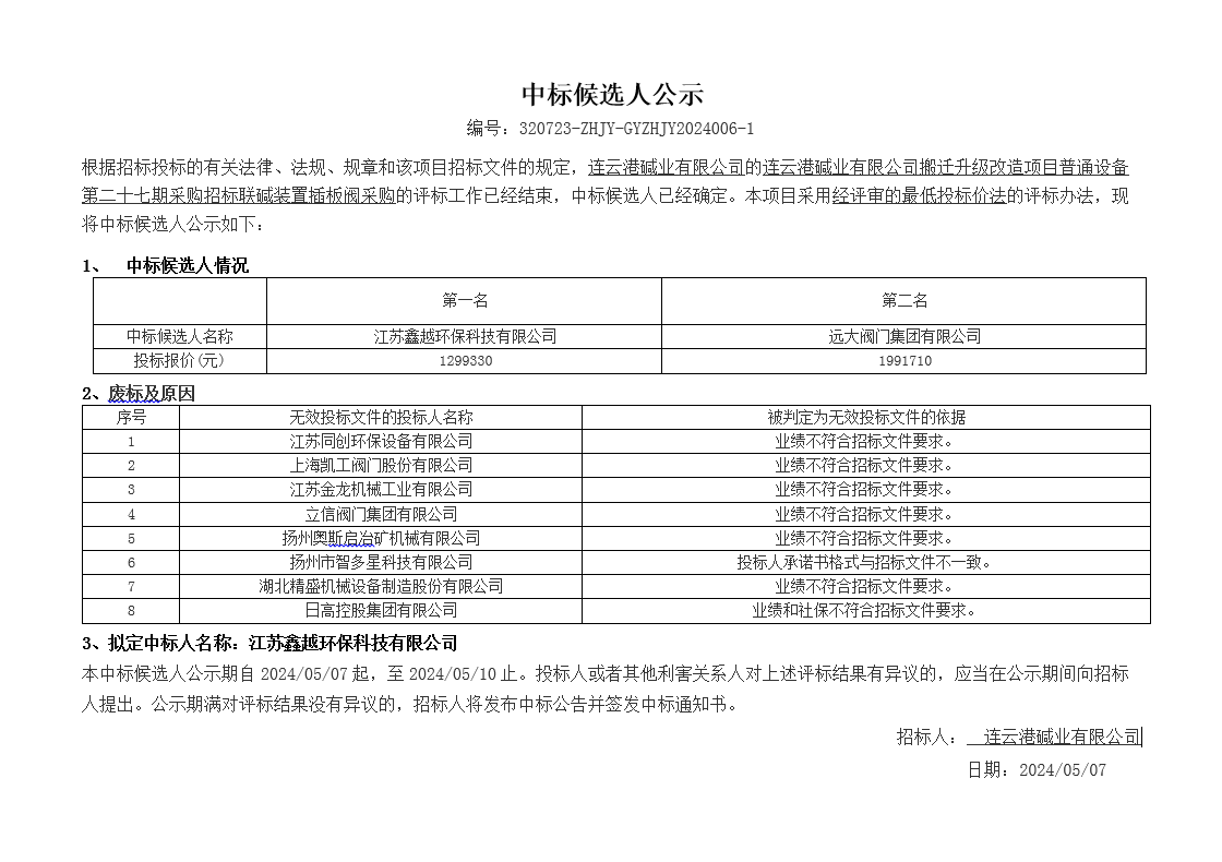 搬遷升級(jí)改造項(xiàng)目普通設(shè)備第二十七期采購招標(biāo)聯(lián)堿裝置插板閥采購中標(biāo)候選人公示