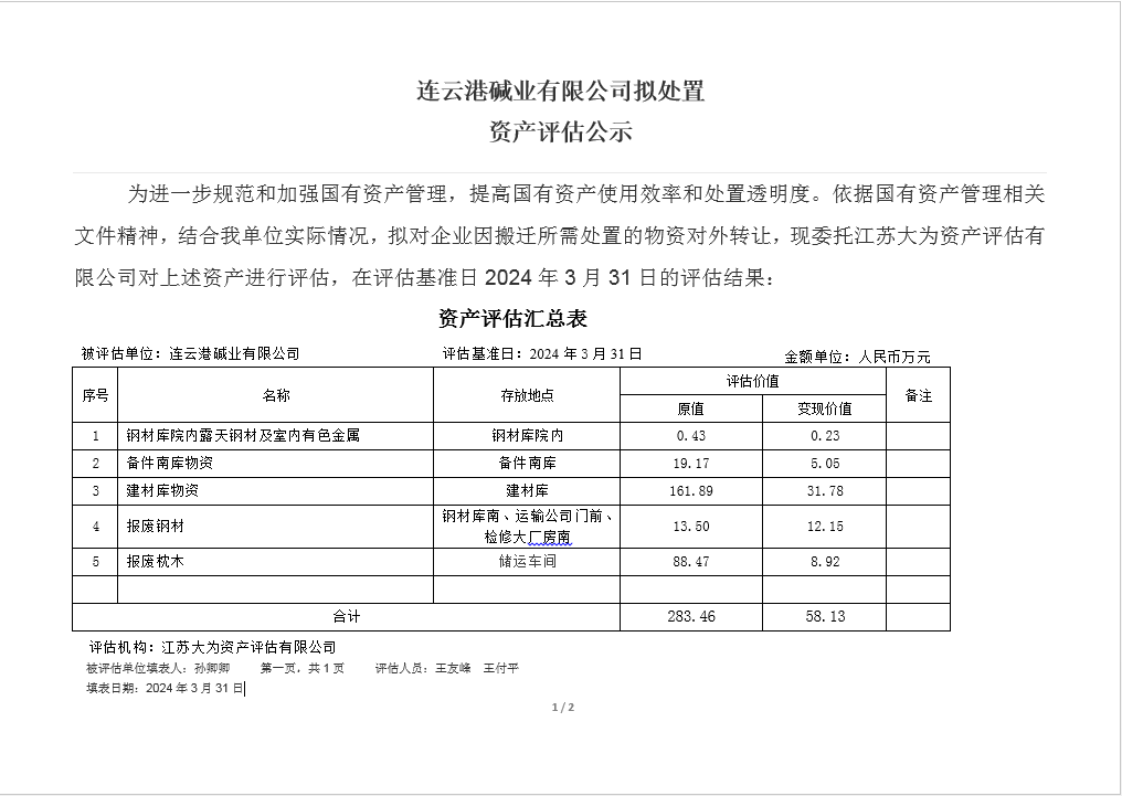 檢修廠房及鋼材庫物資資產評估公示