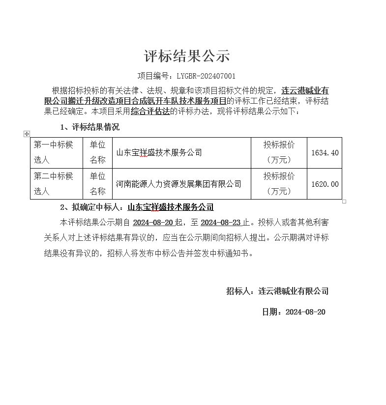 搬遷升級改造項目合成氨開車隊技術服務項目評標結果公示