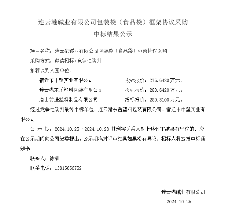 連云港堿業有限公司包裝袋(食品袋)框架協議采購中標結果公示
