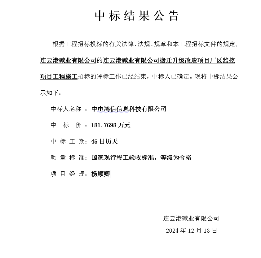 連云港堿業(yè)有限公司搬遷升級改造項(xiàng)目廠區(qū)監(jiān)控項(xiàng)目工程施工中標(biāo)結(jié)果公告